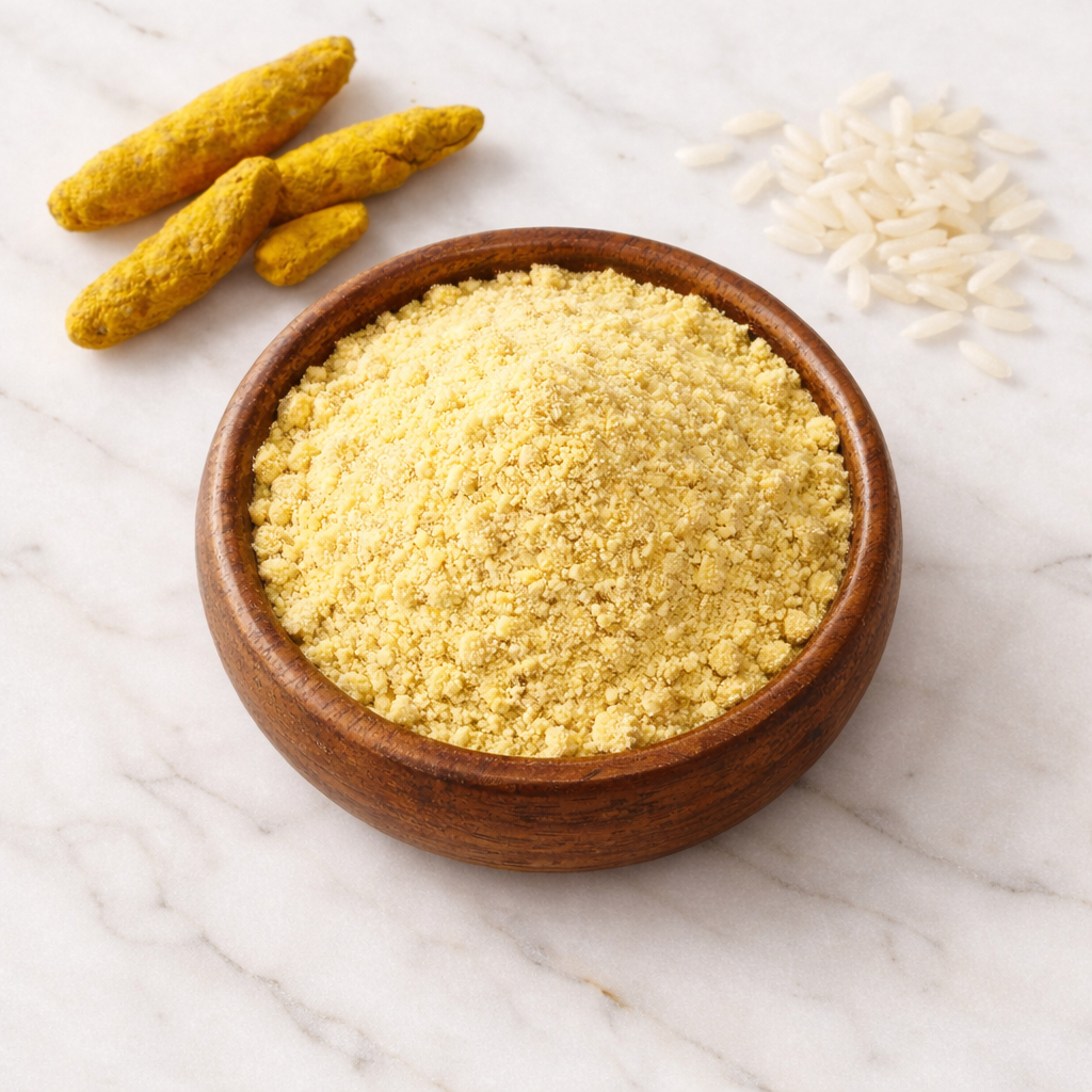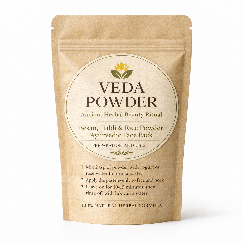 This VEDA POWDER Ayurvedic face pack brings the ancient wisdom of herbal beauty rituals to your modern skincare routine. Crafted with a 100% natural formula combining besan (gram flour), haldi (turmeric), and rice powder, this traditional ubtan offers a gentle yet effective solution for achieving radiant, glowing skin. The time-tested ingredients work harmoniously to provide tan removal, gentle exfoliation, and deep cleansing whilst brightening your complexion. Free from chemicals and preservatives, this herbal face pack is suitable for all skin types, making it an ideal choice for daily use or special occasions. Simply mix 2 teaspoons of the powder with yoghurt or rose water to form a smooth paste, apply evenly to your face and neck, leave on for 10-15 minutes, and rinse off with lukewarm water. Perfect for pre-bridal skincare preparations or as part of your regular beauty regimen, this Ayurvedic formulation helps you achieve naturally clear and luminous skin. Experience the transformative power of this ancient herbal beauty ritual and unveil your skin’s natural radiance.